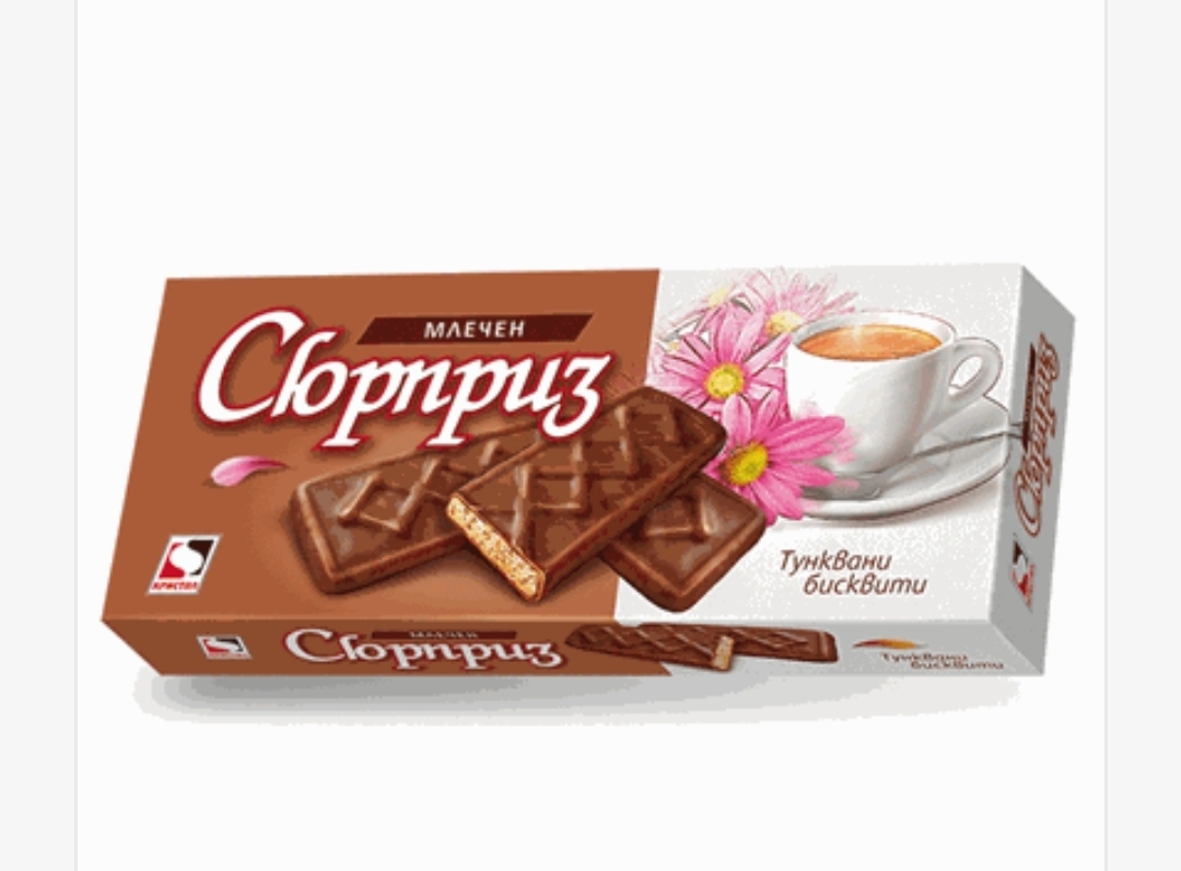 Класическите български бисквити „Сюрприз“ – тънки и хрупкави, покрити с млечен шоколад.