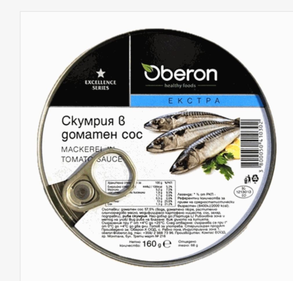 Състав: скумрия, доматен сос (домати, олио, сол, подправки).
